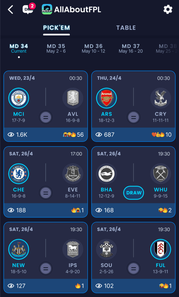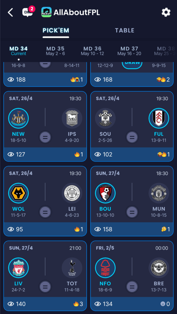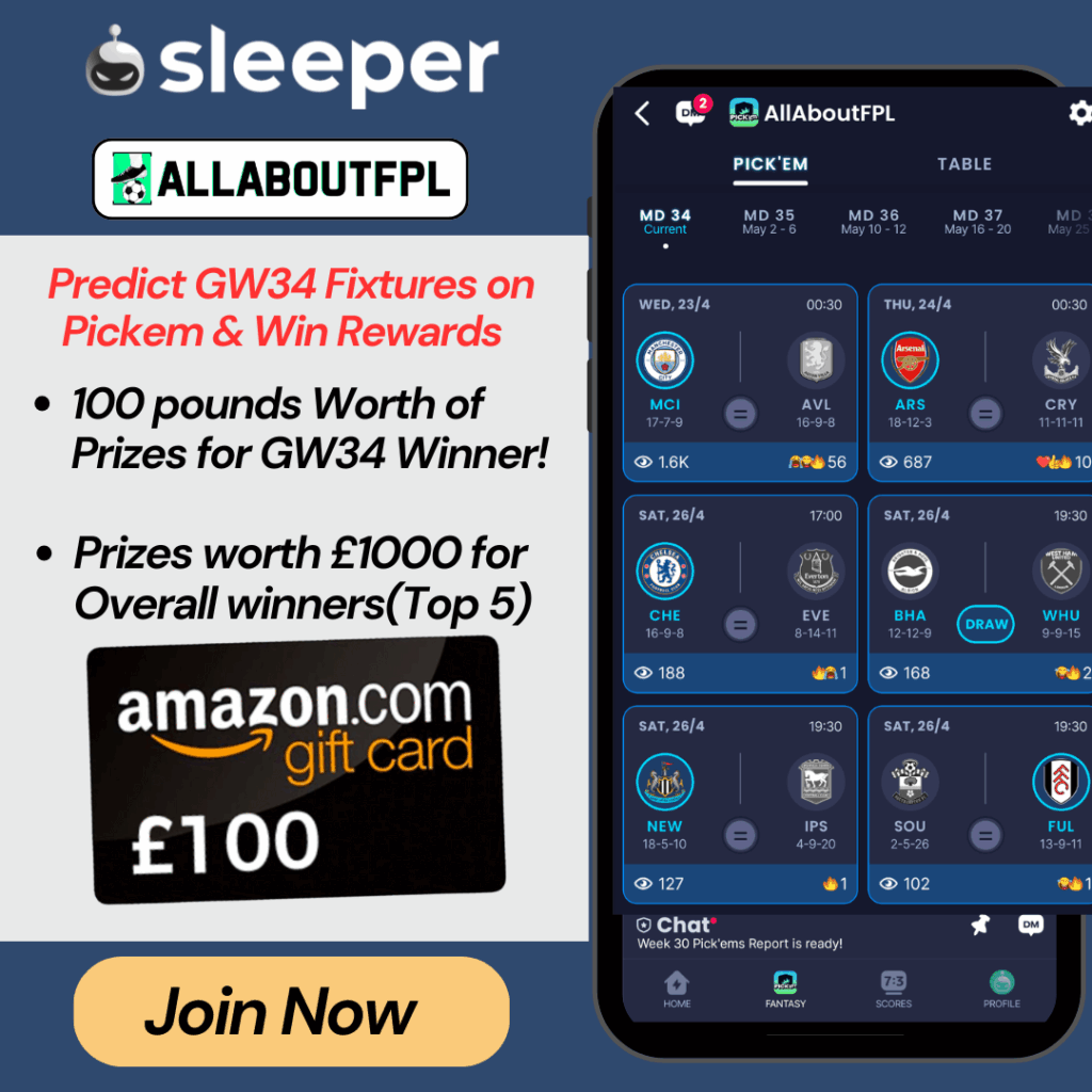 Don’t forget to join the Free to Play GW34 Sleeper Pick’em league and stand a chance to win some amazing prizes every single week!