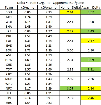 Now let’s look at the difference between team xG/game and opponent xGA/game. The higher the difference, the better the fixture for attacking. Meanwhile lower the difference, the better for defending.