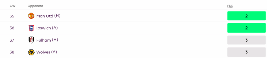 Mikel Damsgaard has been creative force for Brentford this season with 2 goals, 9 assists from 30 starts this season. Brentford are up against a Manchester United and Ipswich in the next 2 weeks who have been both poor defensively this season. Brentford are coming on the back off a 2-0 win over Forest in GW34 and could easily win 4/4 in the next 4 games considering the fixtures they have.