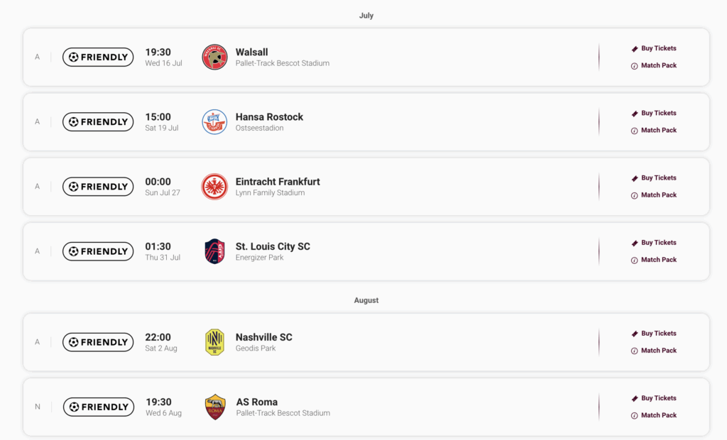 - 16 July: Aston Villa vs Walsall, 7:30 PM