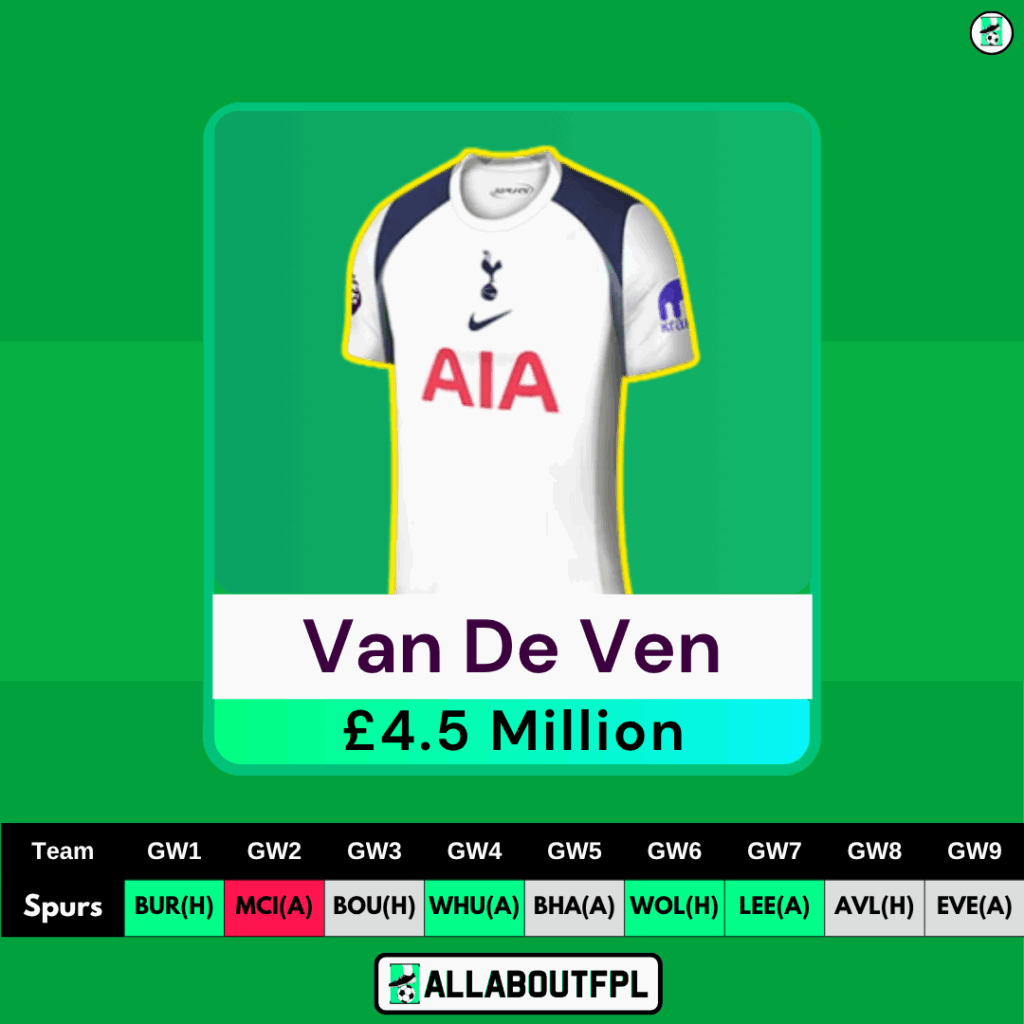 If Udogie is not fully fit before the start of the season, Van De Ven is the best 4.5 million Defender pick from Spurs. He is back from injury and has had a good pre-season so far. Under Frank’s system the center backs are very likely to get lots of Defensive Contribution points as seen with Collins & Pinnock last season. Both Collins & Pinnock featured in Top 15 for CBIT/90 from last season.