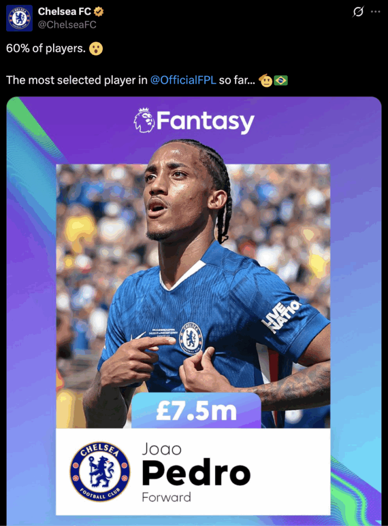 The highest owned player in the game right now (almost 60% ownership) is the next on the list of FPL players to avoid before GW1. Despite having 16 goal contributions last season, Pedro is at a new club, and despite good signs early on, he will be competing with Liam Delap and Nicolas Jackson (if he stays) for a starting spot.