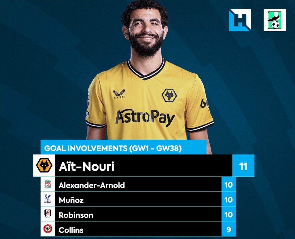 - Ait Nouri and Murillo are the premium defenders in this draft. Ait Nouri picked up 11 goal involvements(4 goals & 7 assists) at Wolves last season, the highest amongst defenders, and has now moved to Man City. Combining his attacking capabilities with Man City’s clean sheet potential, we have got an explosive option.