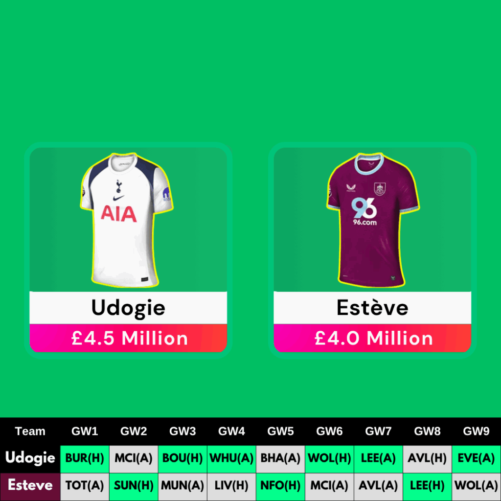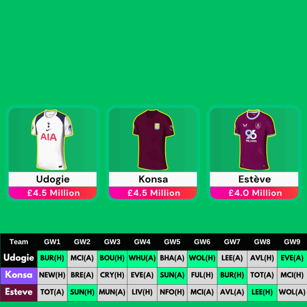 - Udogie/Van de Ven + Esteve rotate well(Rotation planner below) and offer great value at just 8.5 million(combined). As mentioned earlier, Udogie is currently injured, so if he’s not fit, go for Van de Ven.