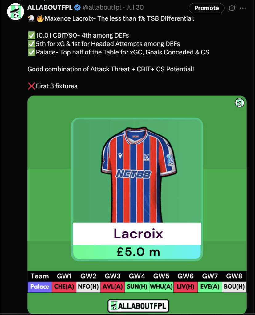 - Lacroix is the differential defender first on the bench, the Palace CB offers a combination of Clean sheets + attacking threat + CBIT potential. Palace fixtures improve from GW4 onwards, so you can have him on the bench for the first few games.