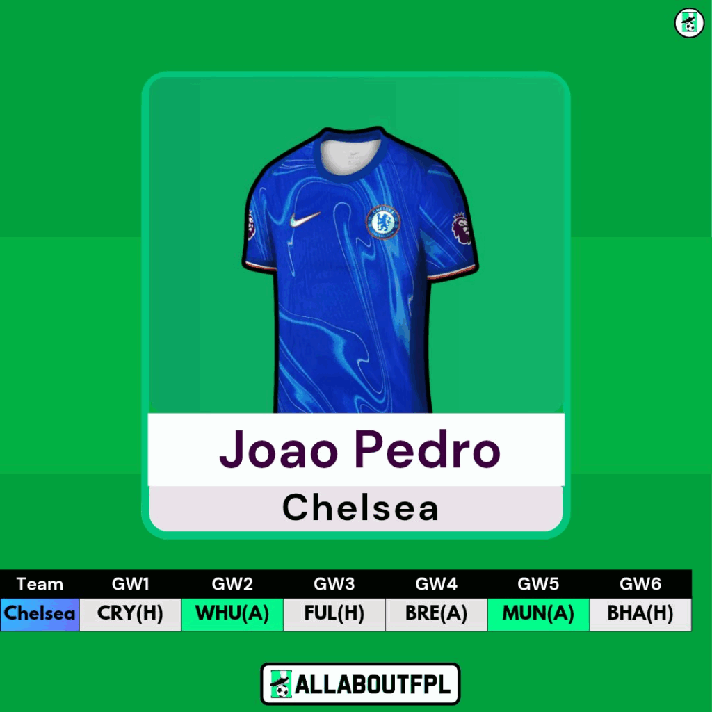 - Joรฃo Pedro is the 2nd striker in this draft, and at just 7.5 million, he’s a bargain, especially since we have gone with Palmer in this draft. The Blues have a great fixture run to begin the season. Pedro has already integrated well with the Chelsea team and was the first-choice forward ahead of Jackson and Delap in the club World Cup semi-finals and final. In the semi-final final he bagged a brace, and he also scored a goal in the final.