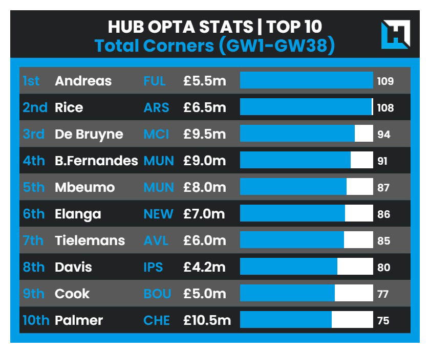 Most Corners Taken by Players in 2024/25 Season: