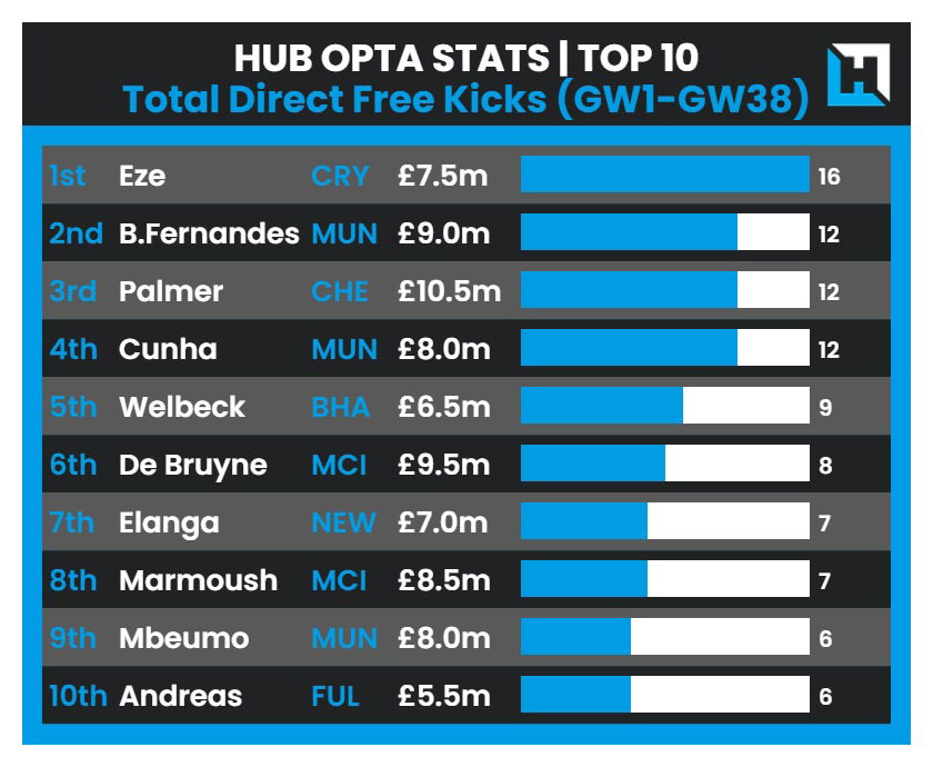 Most Direct Free Kicks Taken during the 2024/25 Premier League Season: