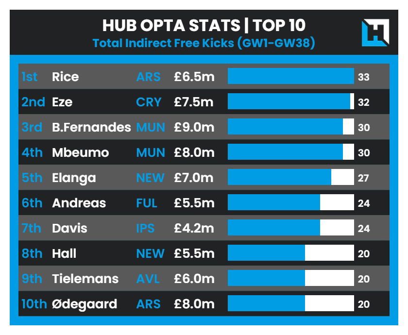 Most In-Direct Free Kicks Taken during the 2024/25 Premier League Season: