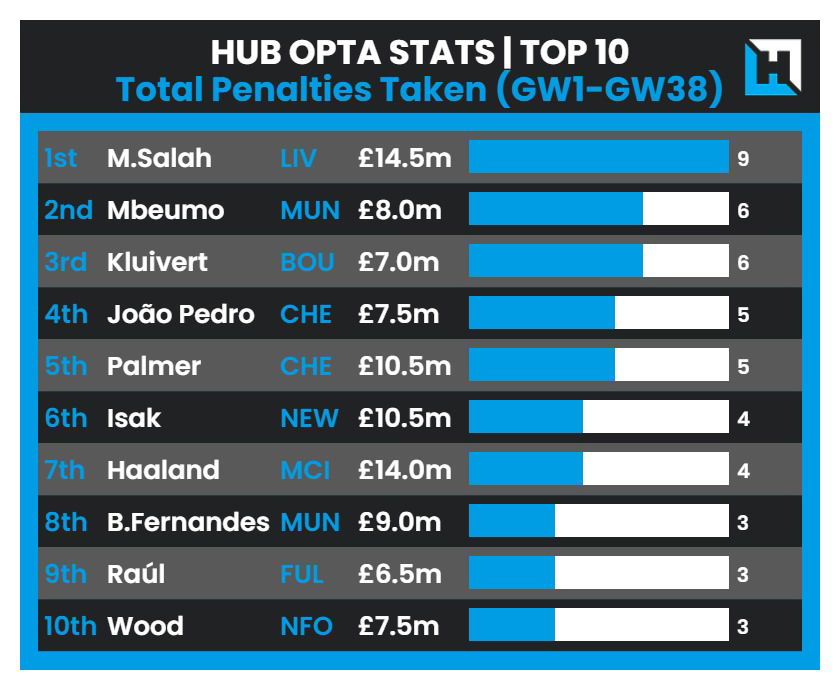 Most Penalties Taken during the 2024/25 Premier League Season: