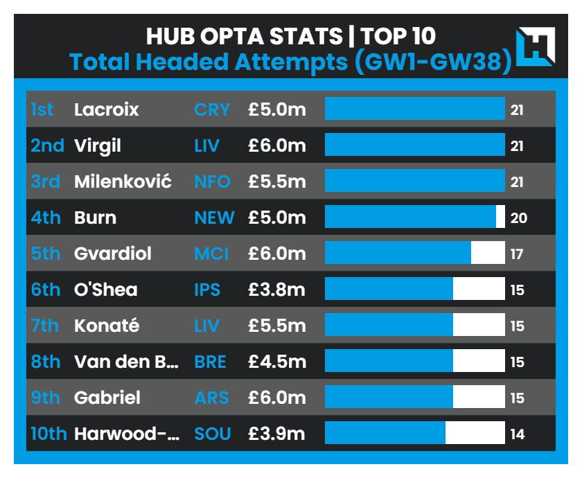 Most Headed Attempts among Defenders during the 2024/25 Premier League Season: