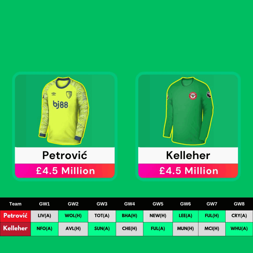 Kelleher is currently the most-owned goalkeeper at 32%, thanks to his expected role at Brentford following Flekkenโs move to Leverkusen. However, Brentford’s fixtures are poor โ just 2.3 xCS in the first 10 โ and the club is undergoing structural change with Thomas Frank leaving for Spurs. While Brentford have historically adapted well, Frank was a constant, and his absence could impact defensive output. Nonetheless, Kelleher rotates well with Petroviฤ, especially over the first 8โ10 Gameweeks.