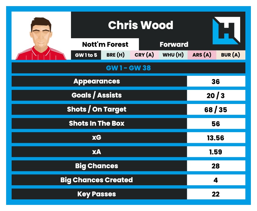 - Wood had an xG of 13.56 and an xA of 1.59. He had 35 Shots on Target and got 28 Big Chances. He also created 4 Big Chances for his teammates.
