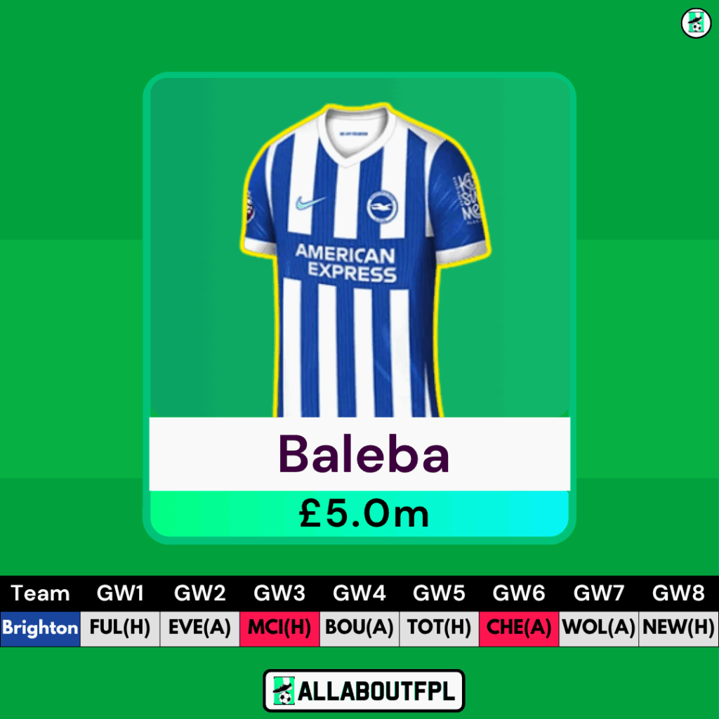 Carlos Baleba is arguably the most CBITR-friendly pick at this bracket – 12.76 CBITR/90 last season. His defensive metrics were outstanding last season: 192 recoveries, regular tackles and interceptions, and extra points potential in nearly half of his starts. Add three goals to that and you have a £5.0m midfielder who can steadily tick along even without attacking returns. Linked with a move to Manchester United, his appeal could rise further if his role changes.