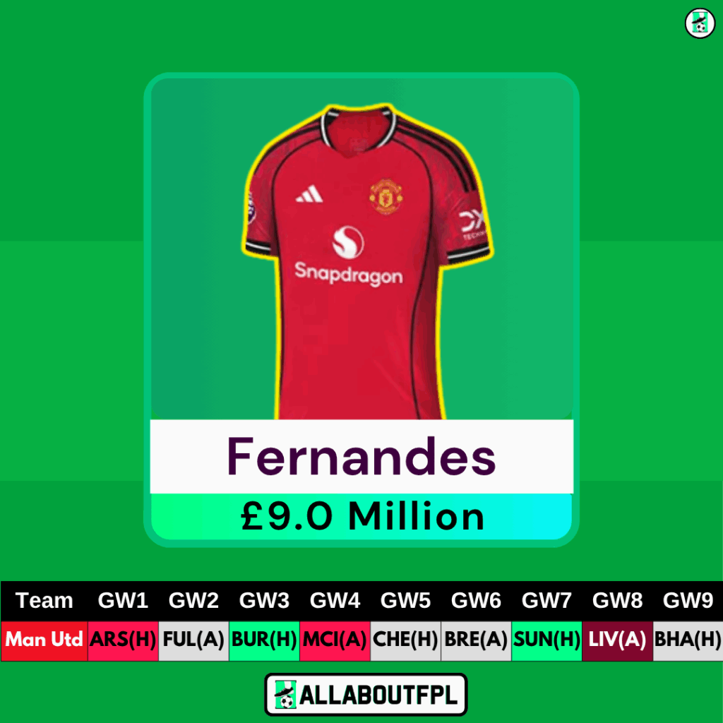 Bruno’s penalty duties, set-pieces, and CBITR potential make him a strong premium option. A nailed 90-minute player with high involvement in United’s attack and on penalties as well despite Mbeumo and Cunha coming in. However with the new front 3 up front, he could be confined to a deeper role which could limit his involvement. It will be good to wait and watch his performance before jumping on him. Anyway Manchester United’s early fixtures aren’t that great either with Arsenal, Chelsea and Man City in the first 5.