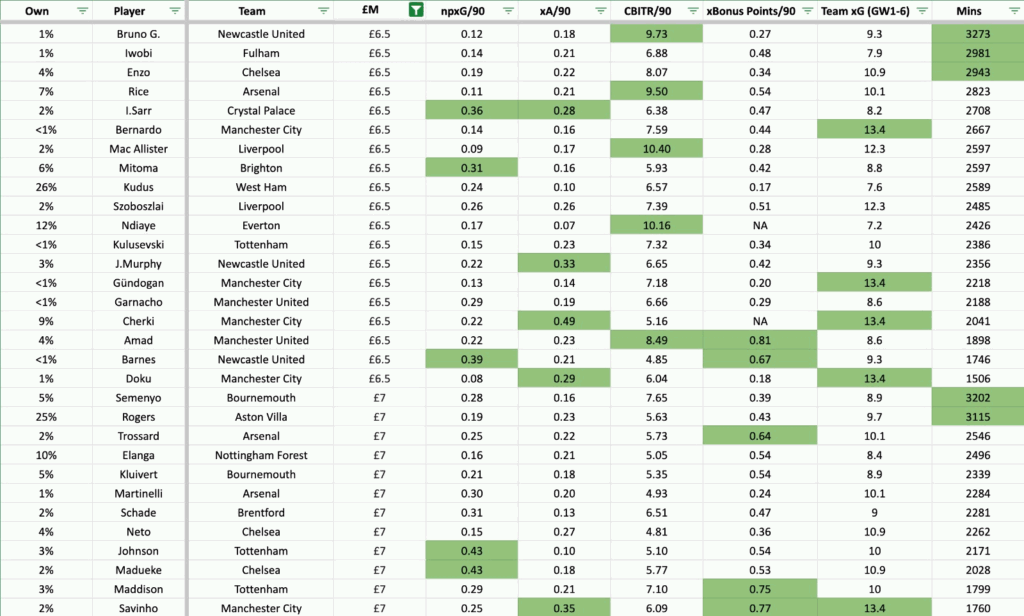 McNeil’s points per start were the best among £6.0m midfielders last season. Creative consistency and a favourable opening run make him a solid value pick for those seeking stability with the odd big return. He had an xA/90 of 0.34 – highest among this group.