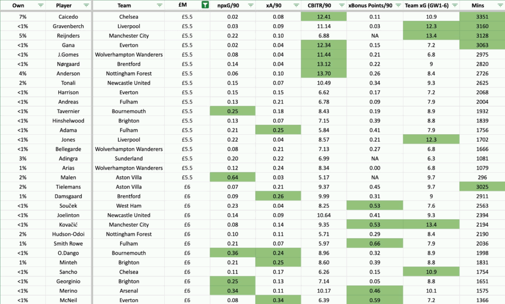A summer arrival from AC Milan, Reijnders brings double-digit goal threat and creative spark. The challenge is minutes under Pep Guardiola, but early signs from the Club World Cup suggest he may be more than a rotation piece. If he starts regularly, he’s a bargain. Manchester City have the highest expected goals over the first 6 GWs as well.