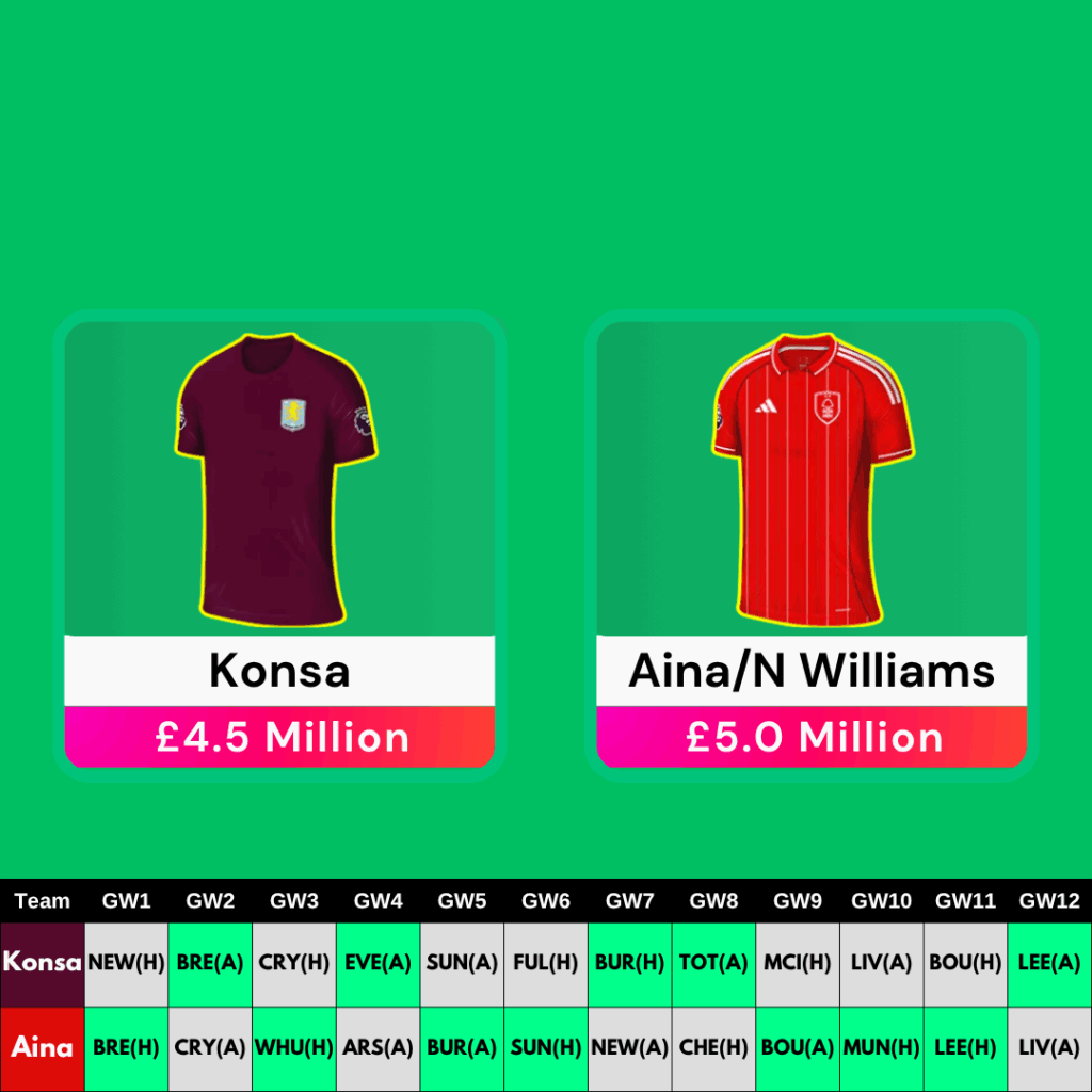 Aina (He has missed the last few friendlies due to a knock, so watch out for updates, you can also get Neco Williams at the same price) and Konsa (4.5 million) rotate really well, and if managed correctly, you can avoid playing any of last seasonโs top six in the opening 12 gameweeks. Esteve at 4.0 million rounds out the back line and looks like one of the most reliable options available at this price point.