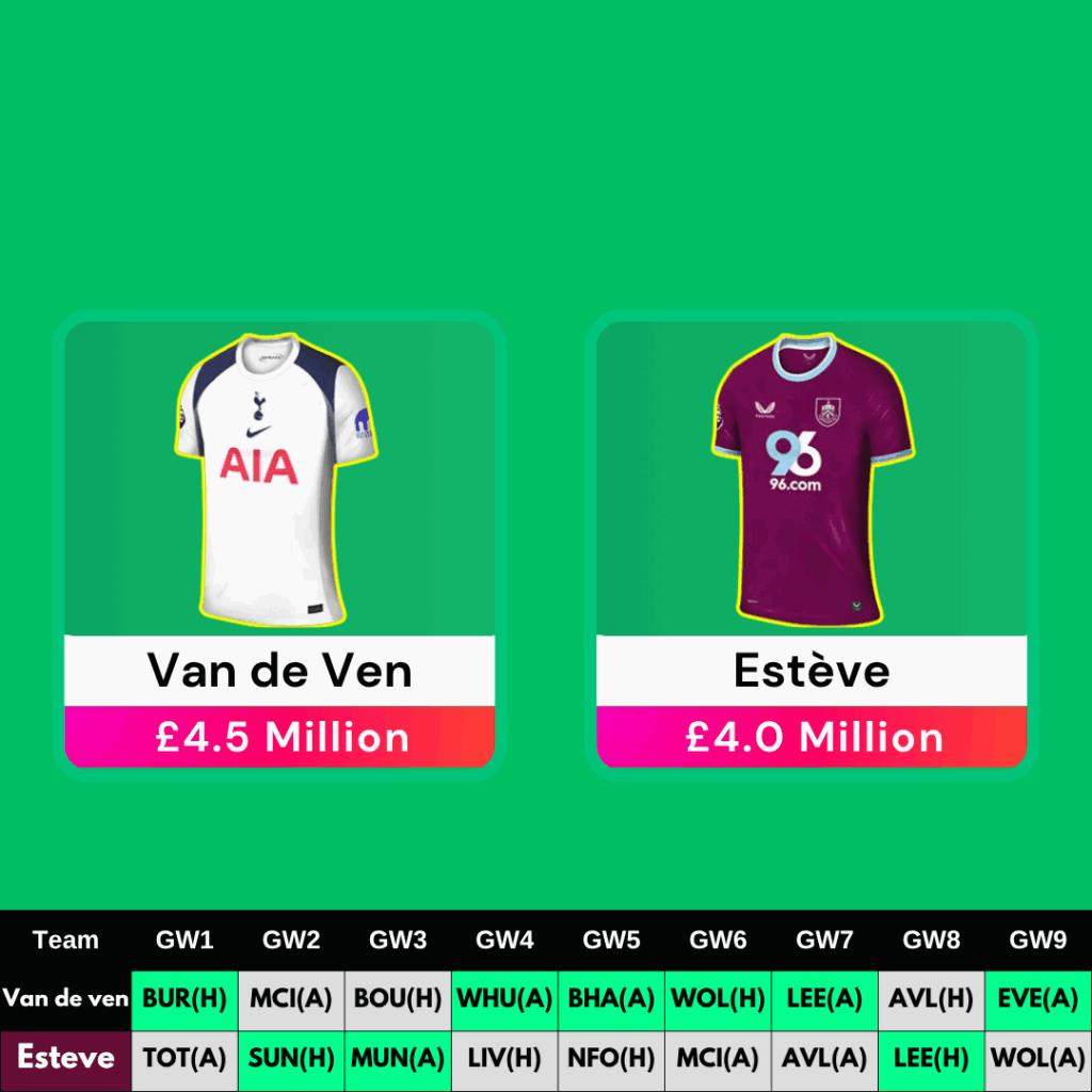 If rotated correctly, you will face zero matches against last seasonโs top six in the opening nine gameweeks, and four out of nine against newly promoted teams. Itโs worth keeping an eye on Udogie, though, as he has missed most of pre-season due to injury. Van De Ven (4.5 million) could be a better alternative, while still benefiting from rotation with Esteve.