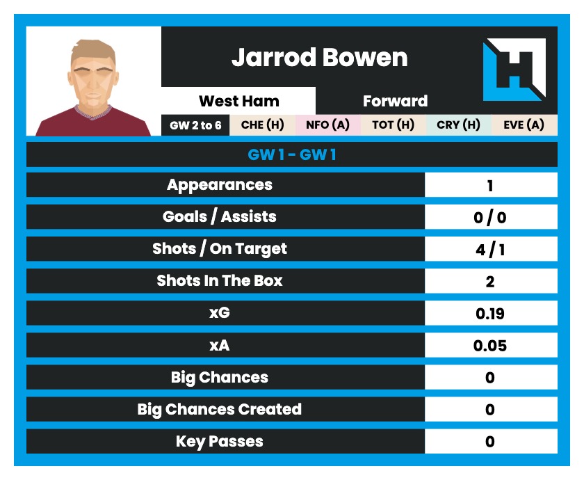 Letโs be honest โ Bowen was always something of a one-week punt for GW1. The punt didnโt land, and now itโs time to move on. His xGI of just 0.2 against newly promoted Sunderland underlined how little attacking threat he actually posed, and the reclassification from midfielder to forward has significantly dented his appeal. Forwards lose out on clean sheet points, and his goals now carry less upside compared to last season.