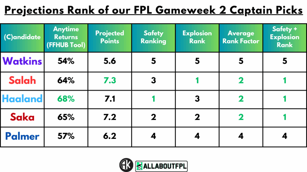 Projections Rank of our FPL Gameweek 2 Captain Picks