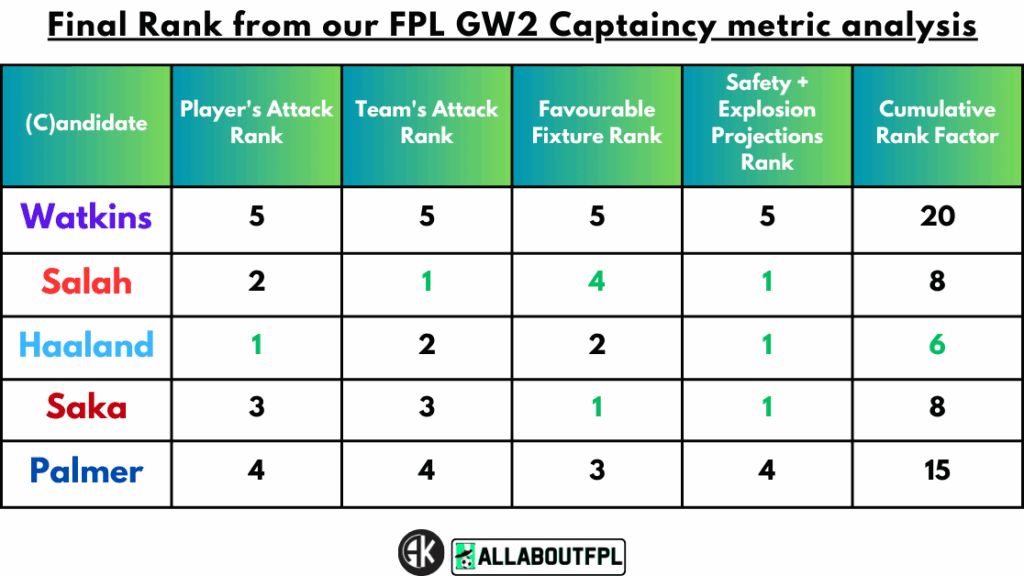 Conclusion – Final Rank from our FPL Gameweek 2 Captaincy metrics