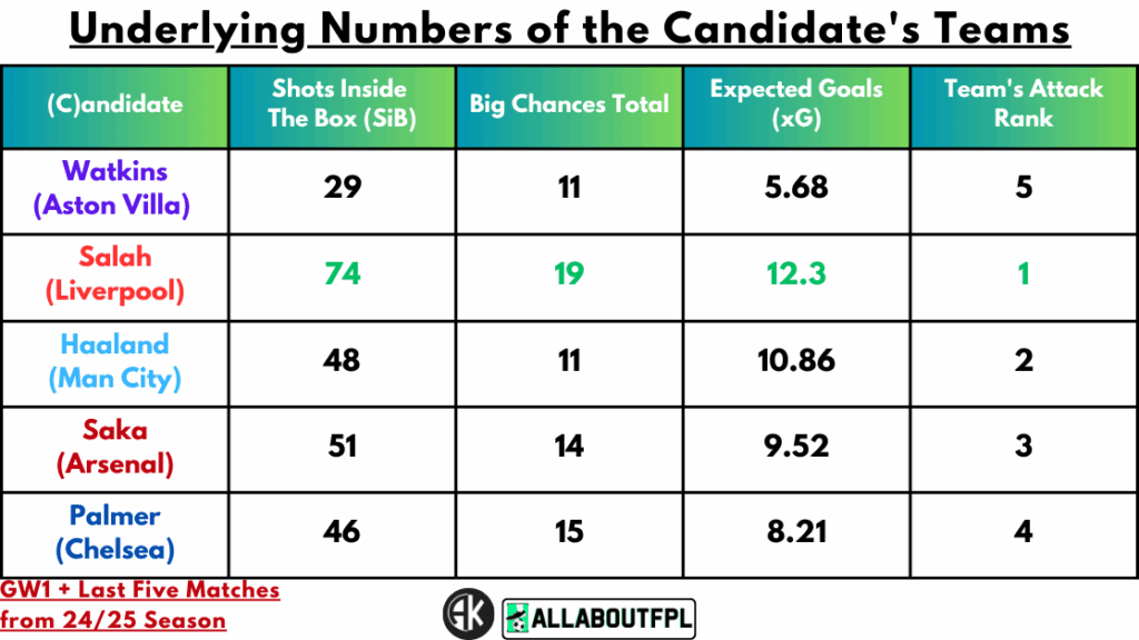 Haaland is top of the table with an xG of 4.23 in the last six games of the 24/25 season. Haaland has also had 15 shots inside the box and 6 big chances.
