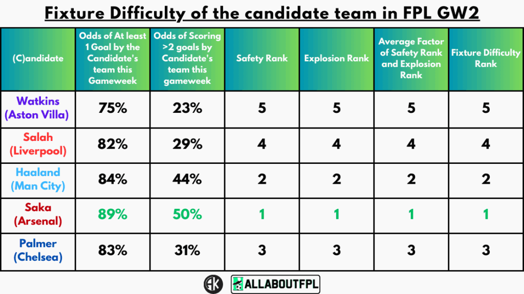 Captaincy is going to be a crucial factor this week, and the popular FPL Gameweek 2 captaincy options include Salah, Haaland, Saka, Watkins, and Palmer. Let’s see who tops the very first captaincy metrics this week. Will it be Haaland or Salah, or someone else?
