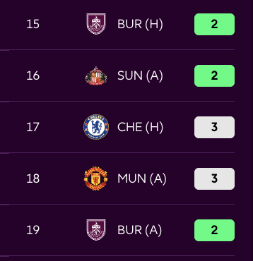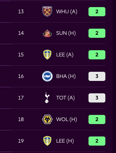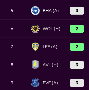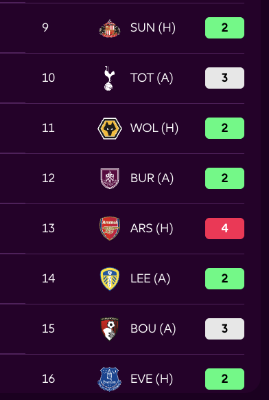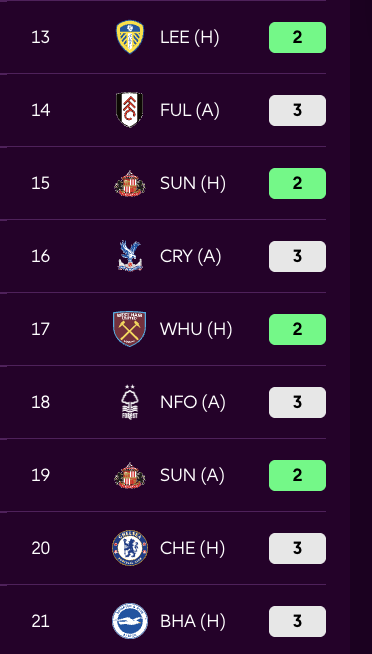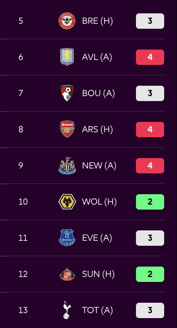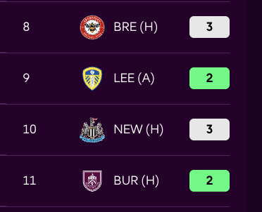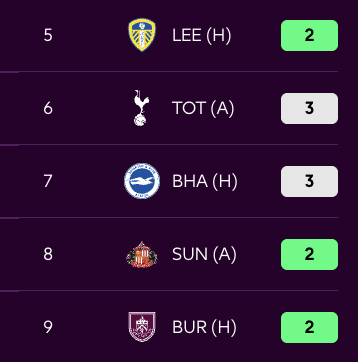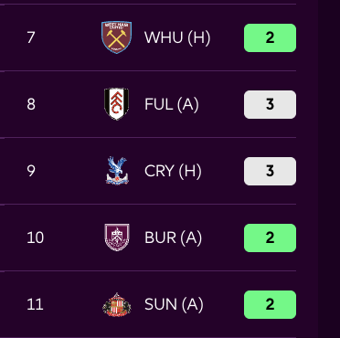This spell begins with a neutral run; Leeds looks favourable. Then FUL (H), CRY (A), NFO (H) are a mixed bag. From GW12: West Ham (H), Sunderland (A), Everton (H) are targetable.