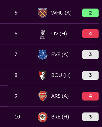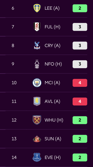 City’s fixtures lift for three weeks – Burnley, Brentford, Everton – then mix until GW12. From GW13 to GW23, it’s a superb run. A GW13 Wildcard could maximise value. GW5 basically allows us for a plan to somehow fit Haaland in our teams.