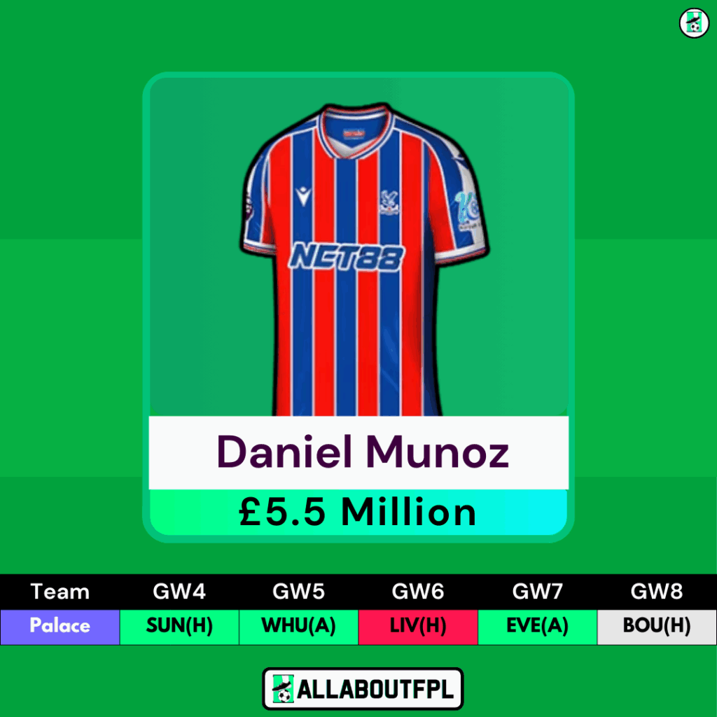 Munoz retains his spot in the AAFPL Scout Picks team as Palace face Sunderland at home in GW4. The Colombian wing-back has returned in each GW so far this season, managing 1 assist, 2 clean sheets, and 20 CBIT (2 DC points). He produced his best total of the season thus far against Villa in GW3, returning 9 points for the 11.5% of managers who own him.