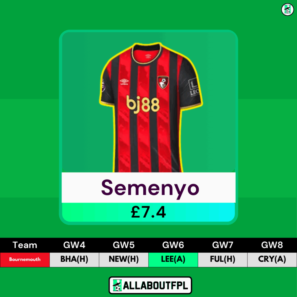 Next up is Bournemouth’s Semenyo. With Sarr now injured, Semenyo has become the most popular midfield target over the international break. Bournemouth have demonstrated yet again that they are immune to a high turnover of players due to their manager’s phenomenal skills and the excellence of their scouting department. While their defense faced much change over the summer, their attack stayed largely the same, and Semenyo in particular has continued to thrive in Iraola’s attacking system.
