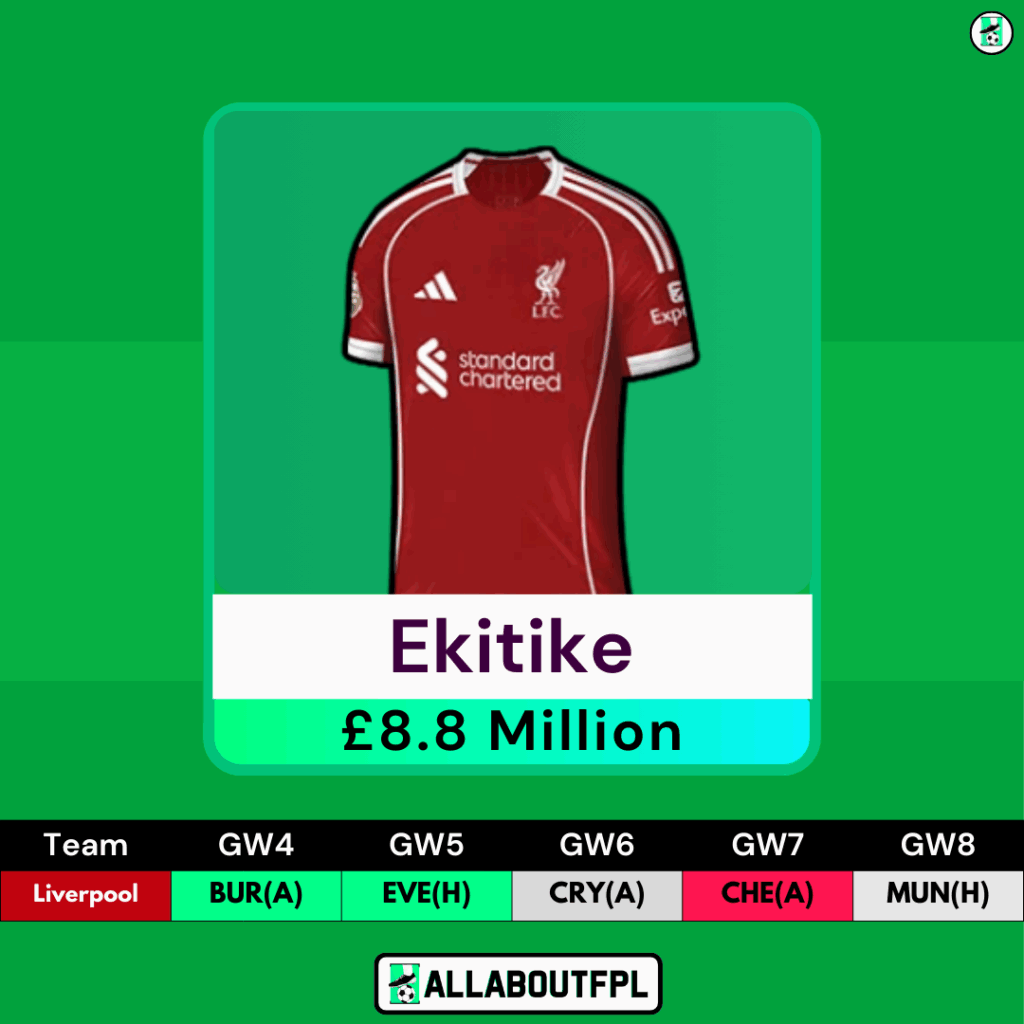 Ekitike completes the Liverpool triple up, joining teammates Salah and VVD in our FPL GW4 Scout Picks team. He has scored the most points of any Liverpool player thus far this season and faces Burnley away from home in GW4. Despite what many are suggesting, Ekitike’s place in the team is safe for now, as Isak is lacking match fitness (as shown by his lack of minutes in the international break).