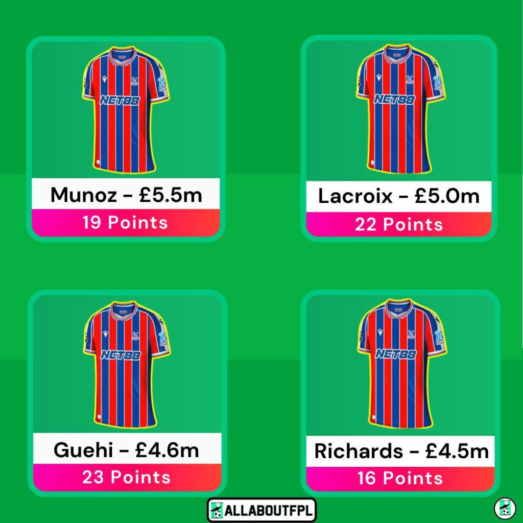 - Defense is loaded up heavily with no compromises made. There is no 4.0 Defender and you can play all the Defenders irrespective of their fixtures as all of them are DEFCON monsters. We have gone with a Palace Double up of Lacroix and Munoz who are capable of Attacking returns, DEFCON and also cleans sheets with the next two fixtures reading SUN(H) and WHU(A).