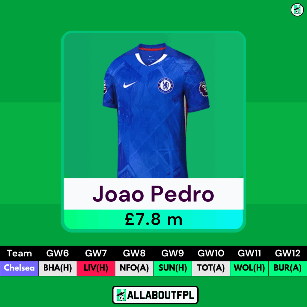 Next up is Chelsea’s Pedro. JP has remained pretty constant in our Scout Picks teams so far this season and has returned in 4/6 matches to date. His 5 goal involvements is pretty good, and he is a vital cog in Chelsea’s slick attack. His underlying numbers are a bit low, which is a cause for concern, but he managed to overperform his expected data last season, and may well do the same again if he continues to grow in confidence in his new Chelsea shirt. Palmer is a doubt for this game, making Pedro a great option as the most nailed Blues attacker.