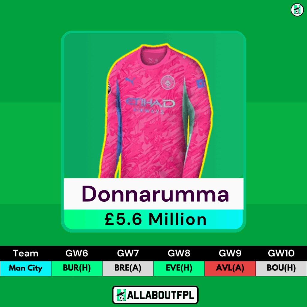 City have looked pretty suspect defensively so far this season too, but the addition of Donnarumma has helped to reinforce their backline. Since his arrival in FPL GW4, City have conceded just 1 goal, with the Italian making some terrific saves against United in GW4 to secure his team’s clean sheet. He is also City’s most nailed defensive asset, with their other CBs tending to be rotated in traditional Pep fashion. His ‘nailed-ness’ makes him the best city defensive asset going into this weekend’s favourable fixture against Burnley.