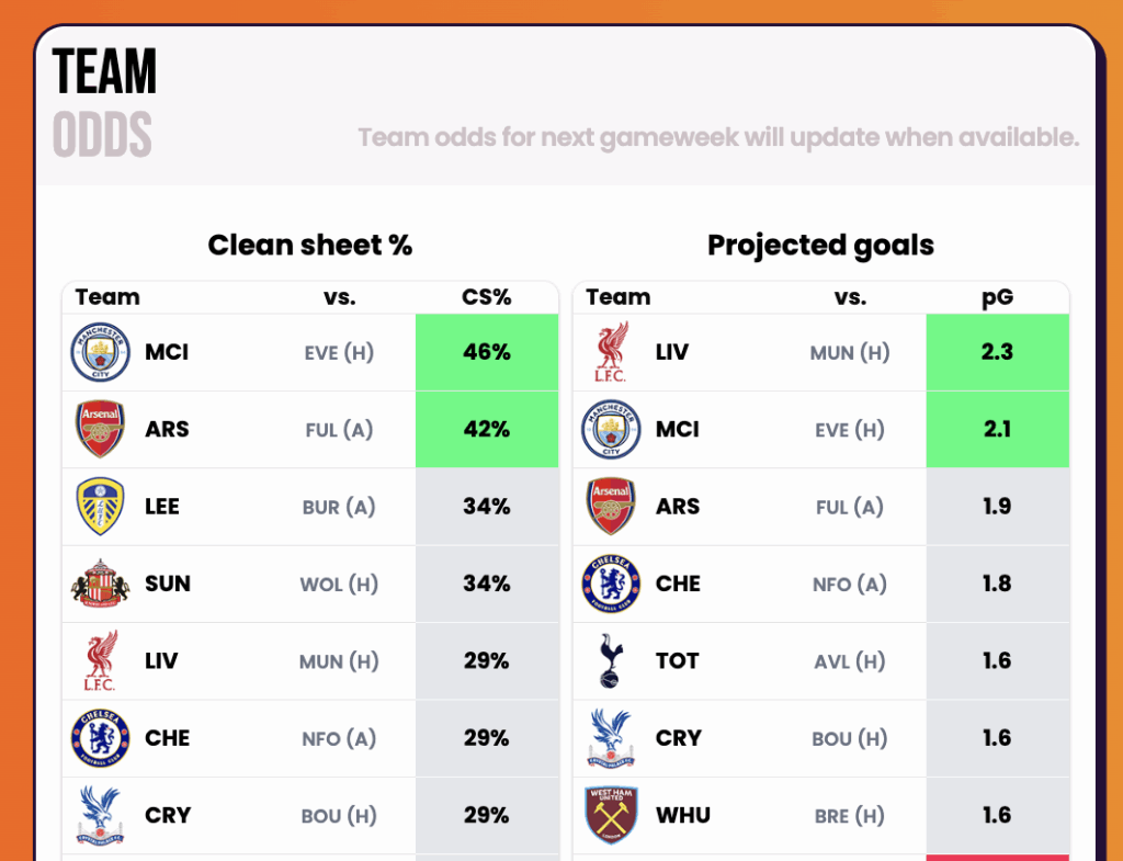 You can find team and player odds for the upcoming gameweek. Odds are available for free from 24 hours before a deadline. Subscribers can access them at any time. The odds are sourced from Spreadex.