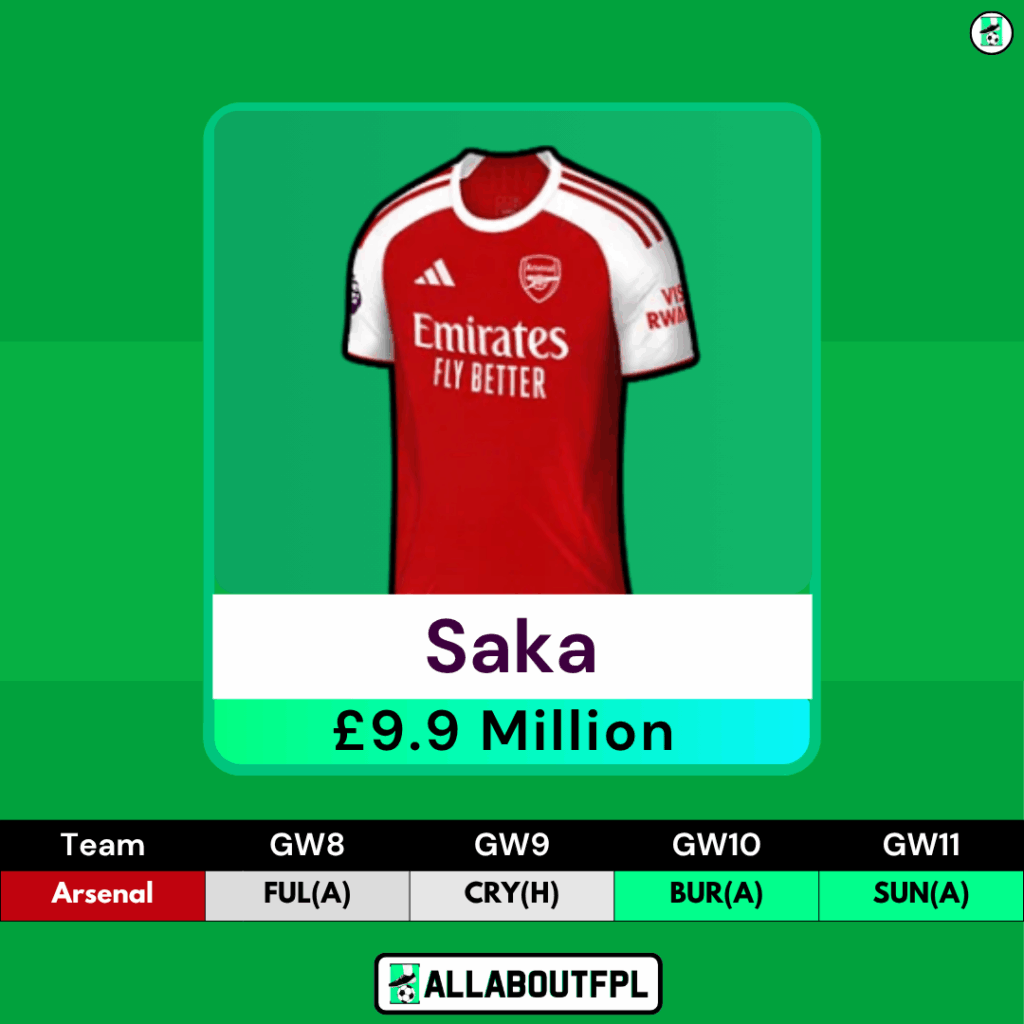 Palace have been in excellent form, and after their upcoming fixtures against Bournemouth and Arsenal, they have a favorable run between GW10 and GW15. Sarr should maintain his form and earn some big points in the coming gameweeks.