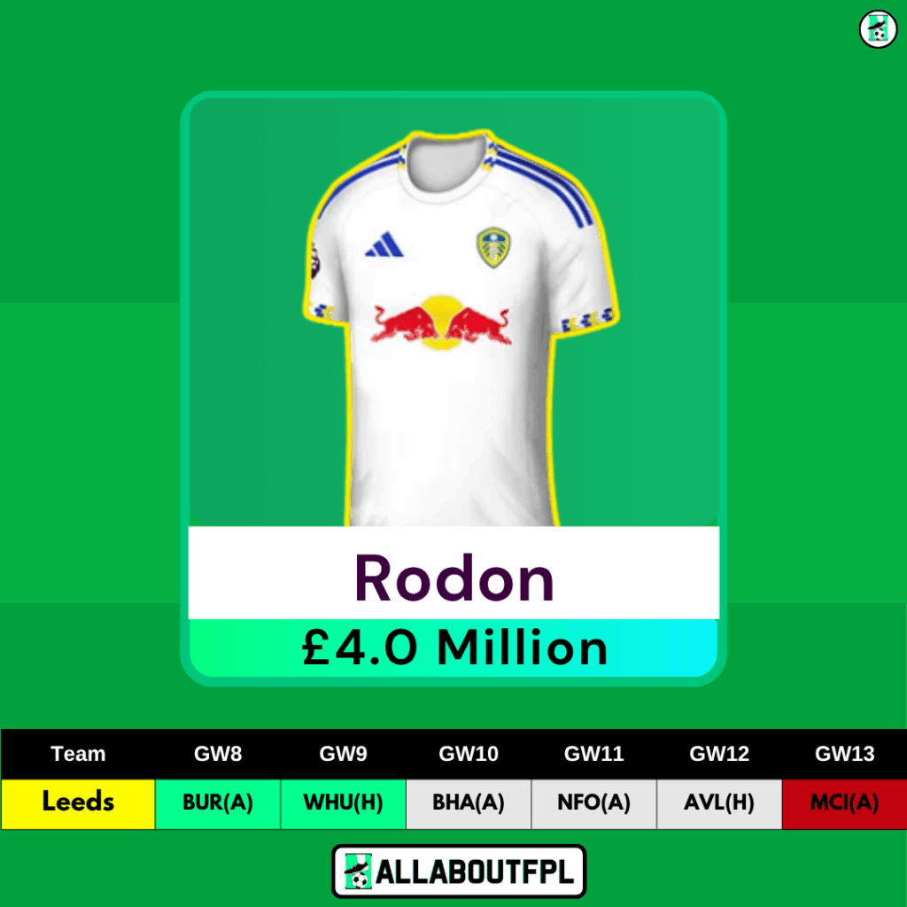 Rodon is another excellent budget pick for managers, and at just 5.4% TSB, he is a very cheap differential option. He has scored 30 points so far and has quite a favorable run of fixtures between GW8 and GW12, so points should be on the cards for Rodon.
