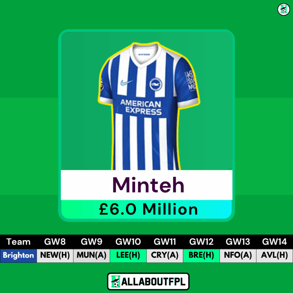 Minteh is another alternative to consider, with just 3.5% TSB and priced at 6.0m. He has scored 31 points this season and could take advantage of Brighton’s long and favorable run of fixtures.