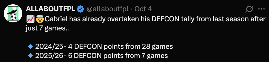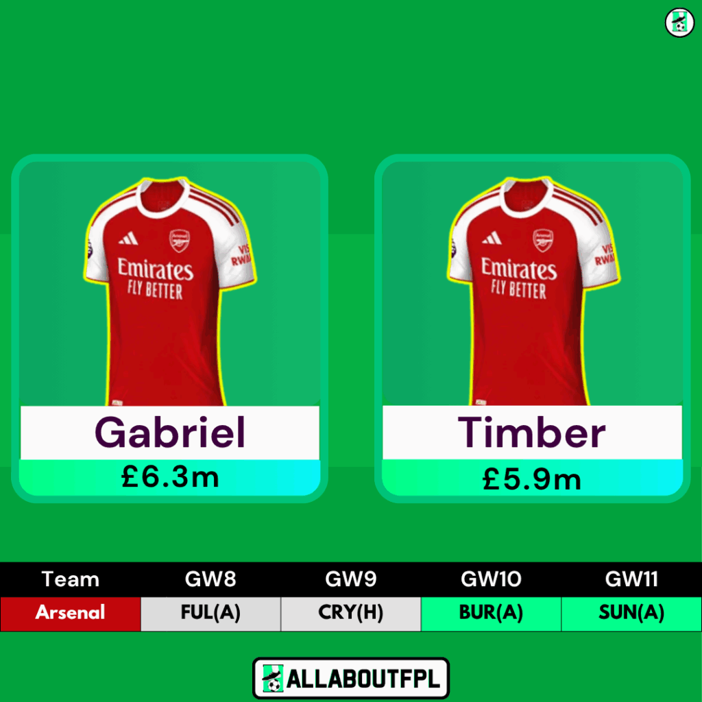 Gabriel has other routes to points as well, with 1 goal, 6 DEFCON points, and 5 Bonus Points this season. Timber, on the other hand, is the high upside pick with no DEFCON potential, but has been very attacking this season. He has been taking up good positions in attack and already has 2 goals, 2 assists this season.