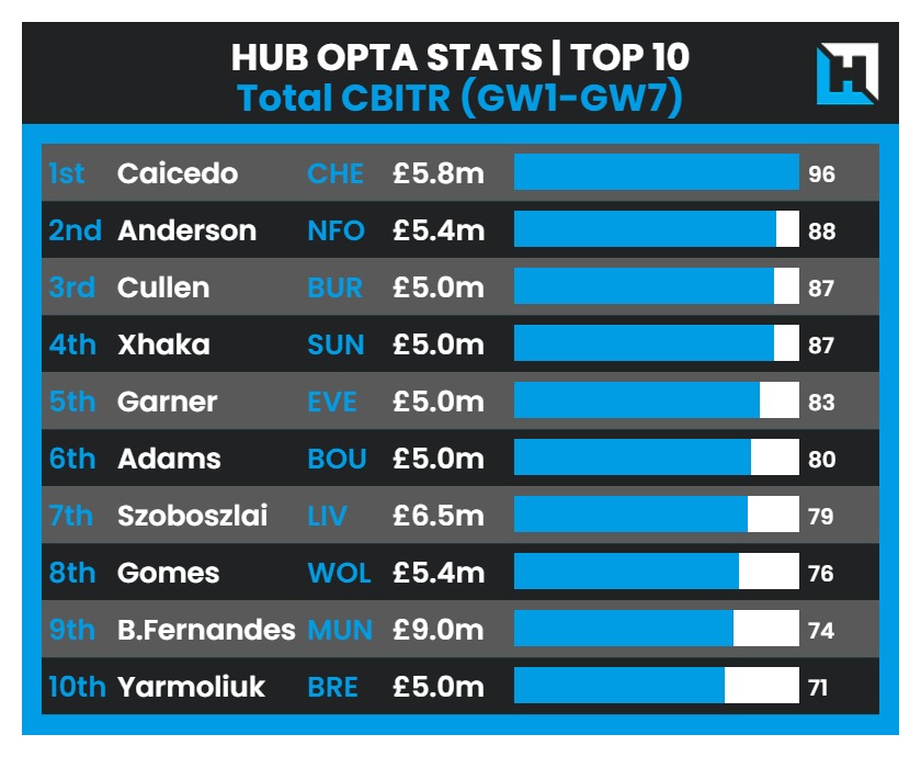- Caicedo rounds up the midfield as the enabler pick and good fixtures coming up. He has 3 goals so far. Even though the goal returns are not sustainable, Caicedo is a DEFCON monster, having hit DEFCON threshold in 4/7 games so far and finishing on 11 DEFCON(1 short) in 2 other games. He, in fact, has the Highest Defensive Contributions among Midfielders this season.