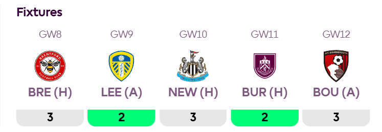 Good fixtures in the next 5 games- NFO(A), SUN(H), TOT(A), WOL(H), BUR(A)