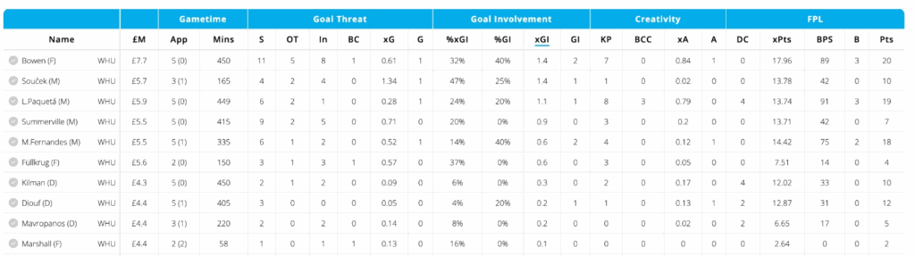 Bowen remains West Ham’s talisman, leading them for shots, expected assists, and FPL points over the last five Gameweeks. With a very favorable fixture at home to Burnley up next, Bowen could be a great one-week punt before a tougher run of fixtures.