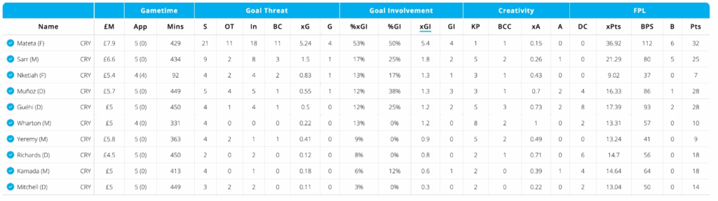 If Palace are quietly climbing up the fixture ticker, Mateta is the man spearheading that charge. He leads all Palace players for shots, goals plus assists, xGI, and total points over the past five Gameweeks.