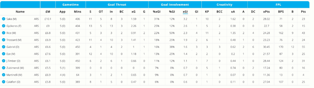Saka continues to be Arsenal’s most influential attacker, even if the points haven’t fully reflected it lately. He’s registered the highest xGI (3.2) among Arsenal assets over the past five matches but has just one goal to show for it.