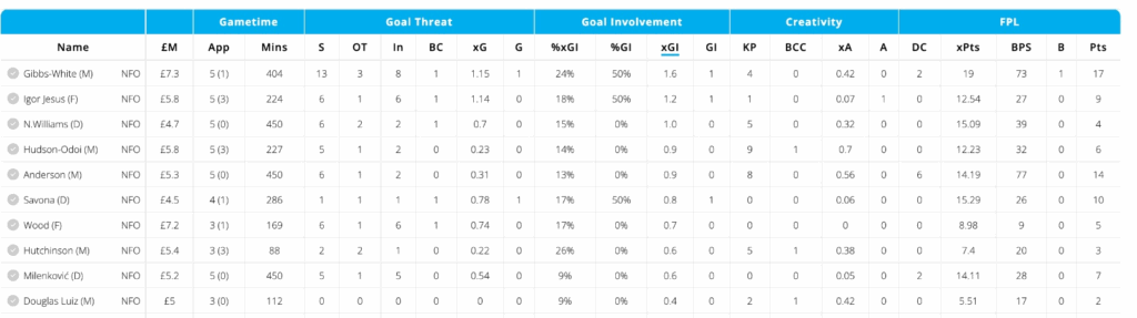 Gibbs-White is emerging as the heartbeat of Nottingham Forest’s attack. He leads his side for both shots and xGI over the last five matches, and his influence was evident in the 2-2 draw against Manchester United, where he created multiple chances and looked a constant threat.