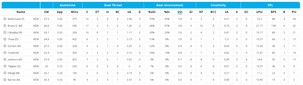 At just £6.6m, Bruno Guimarães offers an excellent blend of creativity, consistency, and minutes. Over the last five Gameweeks, he’s created more key passes and registered a higher expected assists (xA) than any other Newcastle player. He also ranks second for shots and xG, underlining his all-round involvement.