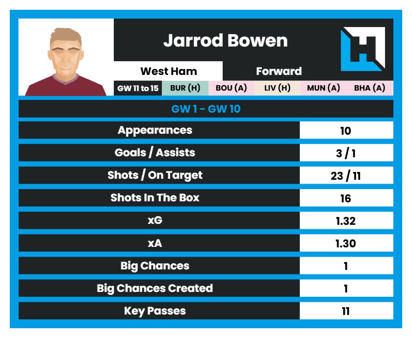 The first player of this week’s article is Jarrod Bowen. Despite West Ham being 18th, Bowen has 4 goal contributions in 10 game weeks. He averages 2.3 shots, generates 0.13 xG, 1.1 Key Passes, 0.9 bonus points and 4.40 points per 90.