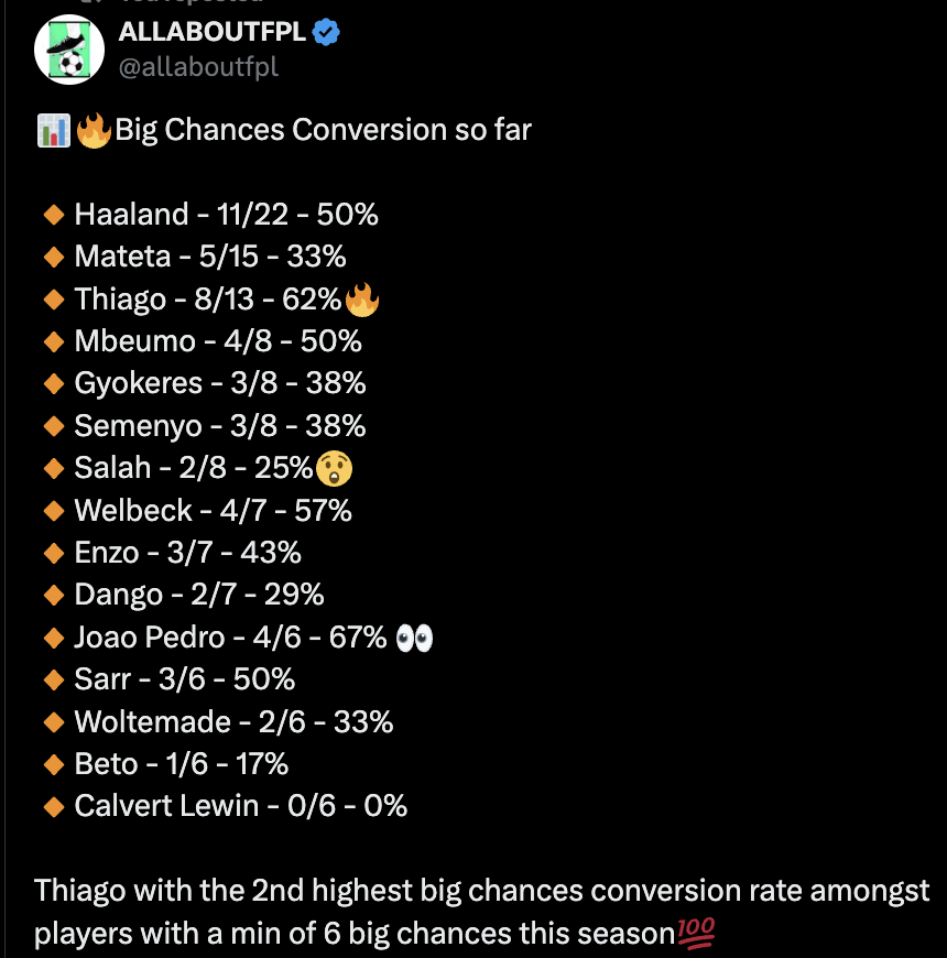 Brentford have had 31 big chances so far this season(6th highest amongst all teams), Thiago has got 13 of them(42% of Brentford’s big chances)